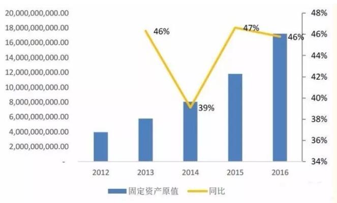 考慮到市場規模的差異,國內企業的網絡及資產規模是成熟期大型供應鏈公司的一半左右。而根據這兩年京東及順豐資產支出的速度(京東購買土地及倉儲、倉儲設施等支出從2015年的32億元上升至2016年的48億元,資產支出速度占原資產50%,順豐2016年新增固定資產原值占比46%),固定資產或土地類資產規模翻倍僅需2-3年時間。
