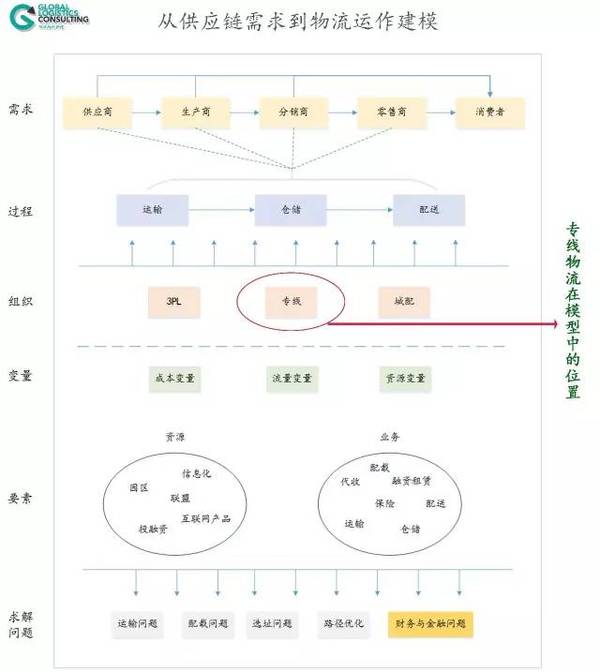 我對(duì)物流動(dòng)作的定義是“組合-拆分”、“運(yùn)動(dòng)-靜止”。運(yùn)動(dòng)主要就是靠運(yùn)輸完成,而實(shí)現(xiàn)運(yùn)輸?shù)闹黧w是“專線物流”。在物流網(wǎng)絡(luò)的建模中,我們通常把運(yùn)輸建在最底層,從理論的角度,我們可以構(gòu)建出各種各樣場(chǎng)景或是理想的狀態(tài)。
